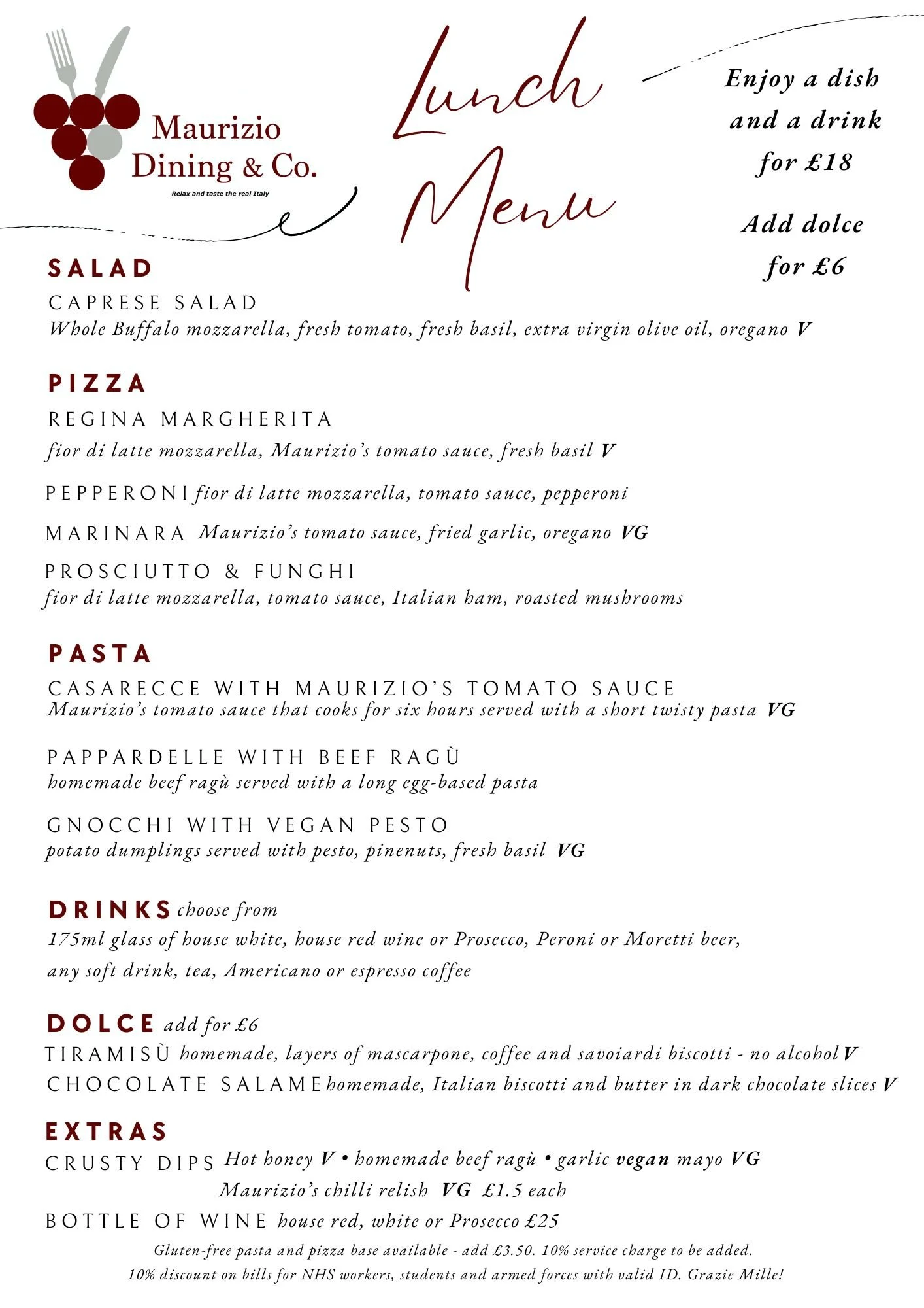 LUNCH * LUNCH * LUNCH * Enjoy Friday and Saturday from 12 to 2pmA dish and a drink for £18Scroll down for the evening menu - available from 5pm Antipasti Wine Pizza Dolce Drinks Pasta